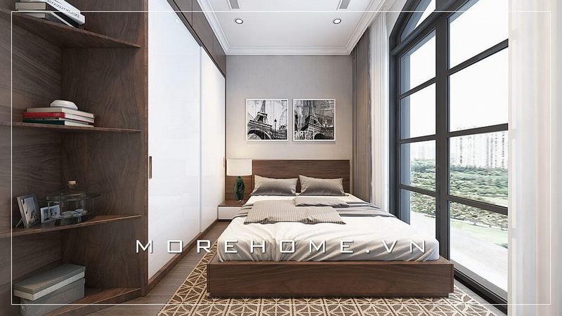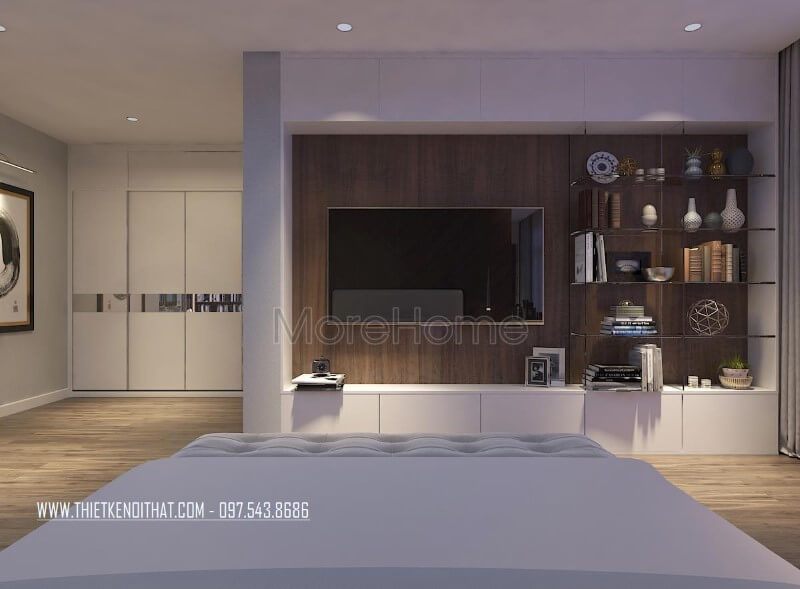 Thiết kế kệ tủ quần áo âm tường cũng góp phần lớn tiết kiệm không gian cho căn phòng