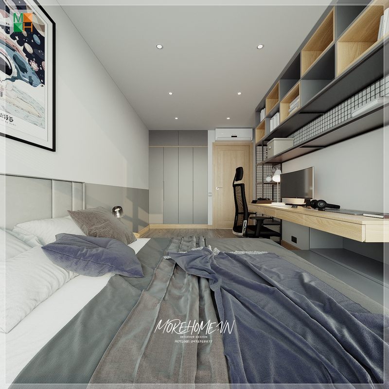 Thiết kế phòng ngủ đơn giản năng động, với tông màu ghi phù hợp với các bạn nam