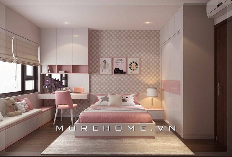 Thiết kế tủ quần áo hiện đại kịch trần kết hợp bàn học, kệ sách đa năng mang đến cho bé gái một không gian học tập nghỉ ngơi thoải mái nhất